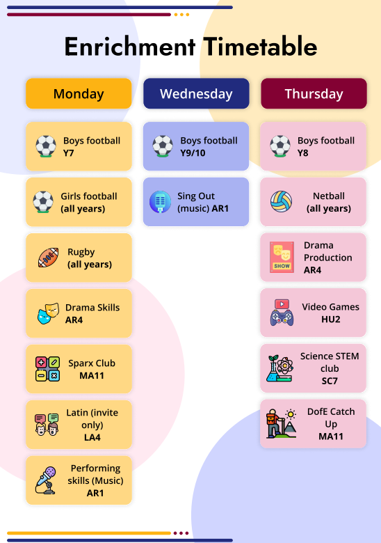 Occasionally enrichment sessions may need to be cancelled, such as when there is bad weather or staff illness. Your child will be made aware of this at the first opportunity so they can plan their journey home.